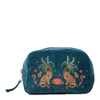 A beautiful velvet makeup bag featuring an intricate jungle design, in a stylish rich blue shade.