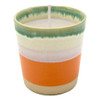 This vibrant boho ceramic candle combines green and orange tones with a soft peach fragrance, creating a warm and inviting atmosphere.
